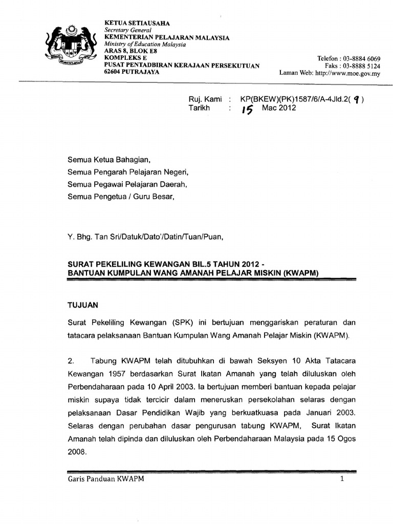 Web Berdasarkan kepada perkembangan dan keperluan masa kini beberapa penambahbaikan ke atas Surat Pekeliling Kewangan SPK Bilangan 2 Tahun 2017 Bantuan Kumpulan Wang. Web Sekirnya anda berminat untuk membantu pelajar miskin boleh memberi sumbangan ke Tabung KWAPM. Web Bantuan KWAPM 2021 ini merujuk kepada duit atau wang yang disalurkan kepada keluarga yang kurang berkemampuan di sekolah rendah dan juga sekolah.